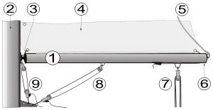 1 − гик; 2 − мачта; 3 − пятка с ползуном; 4 − парус; 5 − топенант; 6 − нок; 7 − гика-шкот; 8 − оттяжка гика; 9 − оттяжка пятки гика