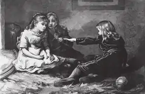 Конни Гилкрист (?) на картине Фрэнка Холла «Лица в огне», 1867 - На самом деле сохранилось описание Кэрроллом этих двух фотографий девочки, которое он дал в своём дневнике. Ни одно из них не совпадает с фотографией, атрибутируемой писателю. 25 мая 1882 года он писал: «Отправился (как договорились некоторое время назад) провести вечер с мистером Коулманом. Я был с ним с 8 до примерно 11, просматривая его рисунки [зарисовки Коулманом тех поз, которые должны принять модели во время съёмки]. Был очень приятный вечер. Я выбрал 22, чтобы отправить мистеру Робинсону с целью фотографирования для меня. Два из них (один в танце [sic], а другой с бубном [sic]) были нарисованы с Конни Гилкрист»[55].