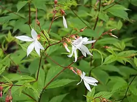 Цветки обоеполые, на длинных цветоножках, собраны на концах стеблей в сложные метёлковидные или щитковидные соцветия-кисти. Чашечка разделена на 5 долей, нахлёстывающихся друг на друга. Венчик состоит из пяти белых или светло-кремовых, иногда розоватых лепестков. В каждом цветке имеются около 15 тычинок и 5 свободных пестиков. Семязачатков в завязи обычно более 2.