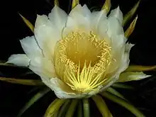 Цветки крупные, длиной до 25—30 см[4] и диаметром около 20 см; открываются ночью[5], ароматные[6]. Цветочная трубка воронкообразная, без колючек[3], покрыта чешуйками[5]. Чёткой дифференциации листочков околоцветника на чашелистики и лепестки нет. Листочки чашечковидной части околоцветника — с зеленоватой центральной жилкой и белым (большей частью) краем, с заострёнными верхушками, отогнутые, по форме — от ланцетно-линейных до линейных, от 10 до 15 см в длину и от 1 до 1,5 см в ширину, с цельным краем. Листочки венчиковидной части околоцветника — белые, узко-обратноланцетовидные[4].