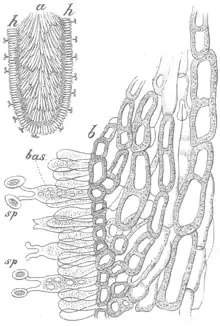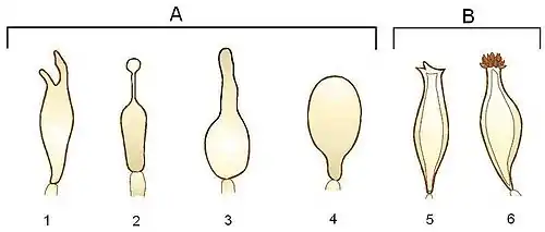 - Парафизами (ед. ч. парафиза, ж.р.; лат. paraphysis от др.-греч. παράφυσις — «разрастание») называют нитчатые гифы аскогимениальных грибов, которые прорастают из субгимения (основания теция) в гимений, они располагаются между асками и свободно оканчиваются[18][2]. Они обычно неразветвлённые и не анастомозируют, реже бывают раздвоенные или слабо разветвлённые, септированные или простые, их концы могут быть прямыми, загнутыми или с небольшими вздутиями. Длина парафиз чаще всего равна длине сумок или немного больше. У дискомицетов парафизы вначале формируют гимениальный слой, затем между ними появляются аски. Функция парафиз — удерживать аски в плотной матрице гимения[19], также они предохраняют аски от взаимного давления и от внешних воздействий[20]. Наличие парафиз характерно для аскогимениальных грибов, у асколокулярных они встречаются очень редко. Они относятся к интераскальным элементам хаматеция[2]. Парафизы, окончания которых возвышаются над слоем асков, формируют дополнительный слой плодового тела — эпигимений. Если концы парафиз срастаются, образуется защищающая гимений ткань — эпитеций[21]. После созревания спор эпитеций разрушается[22].
