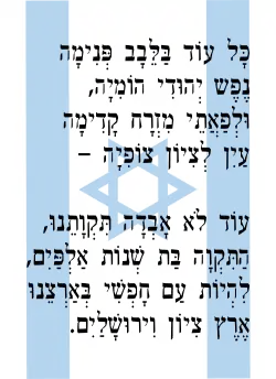 | כָּל עוֹד בַּלֵּבָב פְּנִימָה נֶפֶשׁ יְהוּדִי הוֹמִיָּה, וּלְפַאֲתֵי מִזְרָח קָדִימָה עַיִן לְצִיּוֹן צוֹפִיָּה - |