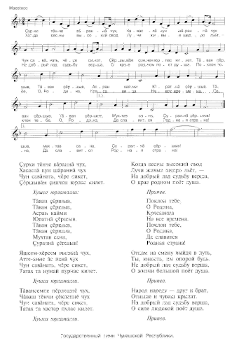 Çурхи тěнче вăраннă чух: Хаваслă кун шăраннă чух, Чун савăнать: чěре сикет, Çěршывăм çинчен юрлас килет. |