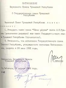 Свой официальный статус гимна песня приобрела после принятия 1 июля 1997 года Государственным Советом Чувашской Республики Закона «О государственных символах Чувашской Республики», подписанного Президентом Чувашии Н. В. Федоровым 14 июля 1997 года[6].