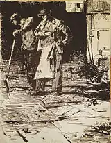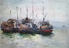Но море для художника - это не только первозданная красота, наполненная неповторимой гармонии, но и место обитания творения рук человеческих – кораблей. В изображении последних он чаще обращается к графическим техникам – рисунку углем, графитным карандашом, тушью, к технике сухой иглы, офорту, линогравюре. В изображении кораблей или сцен из жизни рыбаков ему просто нет равных в композиционных вариациях, каждый лист представляет собой оригинальную неповторяющуюся композиционную схему, которая наиболее соответствует раскрытию каждого конкретного замысла художника.