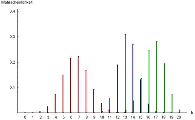 ![]() Функция вероятности для ; (голубой), (зелёный) и (красный) | |