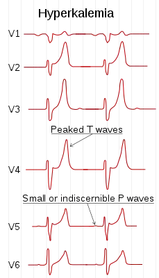 Гиперкалиемия — повышение концентрации калия в крови выше 5,0 мг-экв/л. Сильная гиперкалиемия требует неотложной помощи, поскольку приводит к нарушению сердечного ритма. Нормальным считается уровень калия в сыворотке крови, как правило, от 3,5 до 5,0 мг-экв/л.