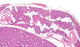![]() Микропрепарат: Паращитовидная железа — слева внизу аденома паращитовидной железы. |