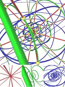 Стереографическая проекция сферического конуса генерирующие линии (красные), параллели (зелёные) и гипермеридианы (синие). Проекция 4D отформатирована в 3D.