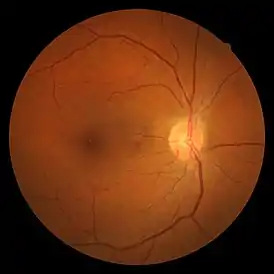 - Повреждения продвинутой ретинопатии, такие как микроаневризм, пятна кровоизлияний и/или кровоизлияния в форме язычков пламени, ишемические изменения (например, «ватные пятна»), жесткий экссудат, а в тяжелых случаях — отек диска зрительного нерва (папиллоэдема, или эдема оптического диска), кольцо экссудата по всей сетчатке, так называемая «макулярная звезда» и потеря остроты зрения, как правило, из-за макулы.
