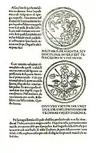 - Аллегорическое изображение (женщина, сидящая на стуле половиной седалища, с крыльями и черепахой в руках, толкование: «Умеряй поспешность сидением, а медлительность вставанием»)