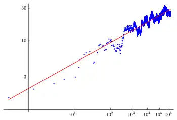 находится в пределах первых 100000 простых чисел. Шкала абсцисс — ; шкала ординат изображена в логарифмическом масштабе. Гипотеза предсказывает, что график должен сходиться к линии, наклон которой равен рангу данной кривой. В случае ранг кривой равен 1. Красным цветом нарисована линия с наклоном 1.