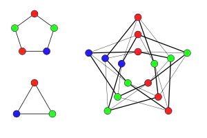 Аналогично, если два графа и не раскрашиваются в 2 два цвета, то есть не двудольный, тогда оба содержат цикл нечётной длины. Поскольку произведение двух нечётных циклов содержит нечётный цикл, произведение также не может быть раскрашено в 2 цвета. Другими словами, если можно раскрасить в 2 цвета, то по меньшей мере один из графов или должен позволять раскраску в 2 цвета.