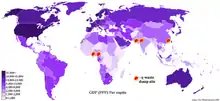 Карта мира, показанная здесь, иллюстрирует, как места захоронения электронных отходов (или места, где граждане или транснациональные корпорации промышленно развитых стран сбрасывают свои использованные электронные устройства) вместе с ППС ВВП на душу населения в этих странах.[6]