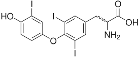 ![]() Трийодтиронин, наиболее активная форма тироидных гормонов | |