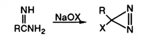 - Взаимодействие амидинов с гипогалогенитами используется как метод синтеза диазиринов[3], использующихся в органическом синтезе в качестве предшественников карбенов[4]: