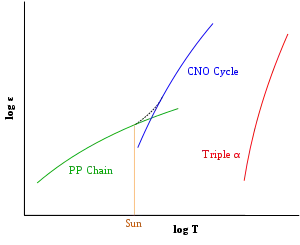При увеличении массы звезды увеличивается температура и плотность в её ядре, а от этих параметров, в свою очередь, зависит частота термоядерных реакций, и, следовательно, мощность энерговыделения. Для протон-протонного цикла мощность пропорциональна 4-й степени температуры в ядре, а для CNO-цикла — 17-й, поэтому при высоких температурах CNO-цикл начинает играть главную роль[27][34].