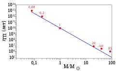 где — соответственно масса и светимость выбранной звезды. Для звёзд главной последовательности светимость возрастает быстрее массы, поэтому, чем больше масса звезды, тем меньше её срок её нахождения на этой стадии. Если грубо принять соотношение масса — светимость за для большинства звёзд, то время жизни будет зависеть от массы как . Для наиболее массивных звёзд соотношение приближается к , поэтому для них срок жизни перестаёт уменьшаться с ростом массы и приходит к значению порядка нескольких миллионов лет, что очень мало по астрономическим меркам[47][48]. Напротив, самые маломассивные звёзды могут находиться на главной последовательности до десятков триллионов лет. Такой большой срок, превышающий нынешний возраст Вселенной, достигается не только благодаря низкой светимости, но и по той причине, что самые маломассивные звёзды полностью конвективны и тратят в ядерных реакциях весь водород, который имеют[32][45][46].