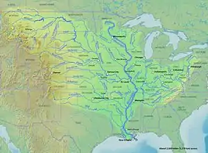 Бассейн реки Миссисипи, главная река выделена тёмно-синим цветом.