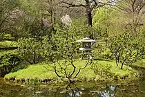 | Японский сад во время цветения сакуры. | Каменная пагода из тринадцати ярусов. | Каменный фонарь юкими-торо — «фонарь любования снегом». | Каменный фонарь орибе-торо — фонарь мастера чайной церемонии Орибе — с цукубаи. | Чайный домик тясицу. |