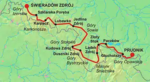На протяжении многих лет маршрут изменялся. Теперь начинается в Свердауве-Здую, проходит через Изерские горы (Высока Копа, 1126 м; Высоки Камень, 1058 м) до Шклярской-Порембы, потом через Карконоше (Водопад Каменьчика, Вельки Шышак — 1509 м, Перевал под Снежкой — 1389 м) до Карпача; следующие этапы это горы Рудавы Яновицкие (Скальник, 945 м) до Кшешува, Каменные и Чёрные горы до Едлины-Здрую, Совиные горы (Большая Сова, 1015 м), Сребряный перевал отделяющий их от Бардзких гор. Далей, через Вамбежице, маршрут ведёт в Столовые горы и до судетских курортов: Кудова-Здруй, Душники-Здруй; далей: Орлицкие и Бистжыцкие горы, водопад Вильчки, Массив Снежника, горы Кровьярки, Лёндек-Здруй, Золотые горы до Пачкува (где в течение многих лет кончался на железнодорожном вокзале) и далей через Калкув, Глухолазы, Опавские горы до Прудника[1].