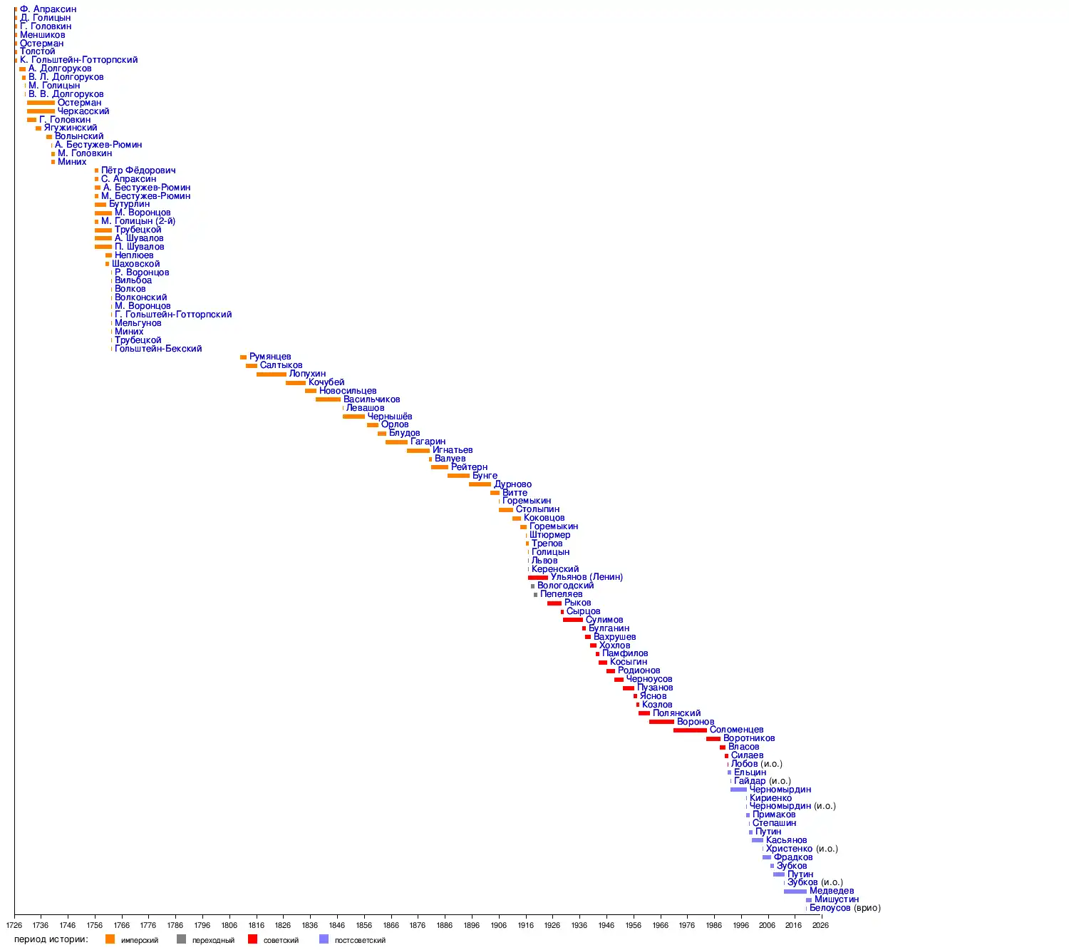 Самый продолжительный срок находился во главе правительства — 10 лет 315 дней — князь Пётр Васильевич Лопухин, председатель Комитета министров в 1816—1827 годах.