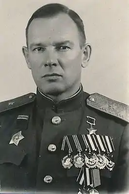 - Шесть орденов Красного Знамени (31 декабря 1941[5], 20 сентября 1943[6], 27 июля 1944[7], 3 ноября 1944[8], 24 июня 1948[9], 28 октября 1967);