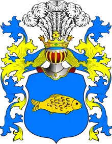 В голубом поле плывущая влево золотая рыба. На шлеме пять страусовых перьев.