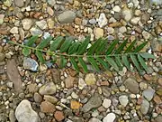Листья очередные, почти сидячие[5], длиной 14—20 см и более, парноперистые с 8—15(17) парами листочков или дважды-парноперистые с 8—14[5] парами ветвей на главном желобчатом и опушённом листовом стержне, на укороченных побегах, собраны пучками. Листочки в первом случае длиной 4,5—5 см, по другим данным до 3,5 см[6], по третьим — до 3(4) см[7]; во втором — мельче, до 2 см[6], по другим данным 0,8—1,5 см[7]; тёмно-зелёные, блестящие, эллипсоидные или ланцетные, к верхушке суженные, по краям цельнокрайние или неясно городчатые, снизу по жилкам слегка опушённые. Распускаются в апреле.