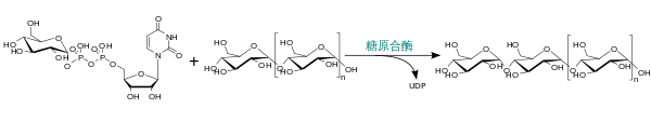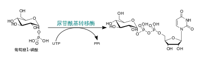 - Глюкозо-1-фосфат + UTP → UDP-глюкоза + PPi