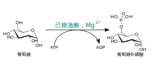 - D-глюкоза + ATP → D-глюкозо-6-фосфат + ADP.
