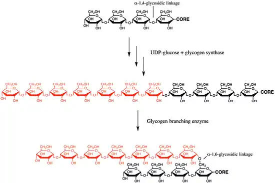 Гликогенсинтаза создаёт (α1→4)-гликозидные связи, однако она неспособна создавать (α1→6)-гликозидные связи, которые располагаются в точках ветвления гликогена. Эти связи образует гликогеноразветвляющий фермент, или амило-(1→4)-(1→6)-трансгликозилаза, или гликозил-(4→6)-трансфераза. Гликогеноразветвляющий фермент катализирует перенос терминального фрагмента длиной 6 или 7 глюкозных остатков с нередуцирующего конца ветви гликогена длиной не менее 11 остатков на гидроксильную группу при шестом атоме остатка глюкозы, располагающегося ниже, причём он может принадлежать как той же самой, так и другой цепи. Таким образом создаётся новая ветвь гликогена[5].