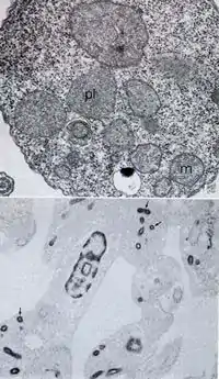 Термином «гликосома» также обозначают гликогенсодержащие структуры, найденные в гепатоцитах и необходимые для запасания сахара, однако эти структуры не окружены мембраной[4].