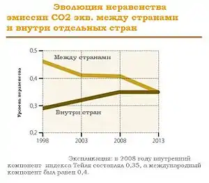 По данным Oxfam и Stockholm Environment Institute за 2015 год, на 10 % наиболее состоятельных людей в мире приходится 50 % выбросов CO2, при этом 15 % выбросов приходится на 1 % самых богатых, что примерно в два раза превышает выбросы, приходящиеся на долю 50 % из нижней части шкалы доходов (7 % выбросов). При этом негативные последствия выбросов CO2 наиболее сильно воздействуют на бедную часть мирового населения[40].