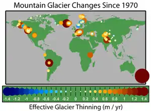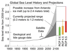 - Таяние арктических льдов, повышение уровня моря, отступление ледников: глобальное потепление привело к десятилетиям сокращения и истончения арктического морского льда. Сейчас он находится в опасном положении и уязвим для атмосферных аномалий[81]. Прогнозы сокращения арктического морского льда отличаются друг от друга[82][83]. Последние прогнозы предполагают, что Арктика может быть свободной ото льда (определяется как протяженность льда менее 1 миллиона км²) в летний период уже в 2025—2030 годах.[84] По оценкам, повышение уровня моря с 1993 года составляло в среднем от 2,6 мм до 2,9 мм в год ± 0,4 мм. Кроме того, повышение уровня моря ускорилось за период наблюдений с 1995 по 2015 год[85]. Сценарий МГЭИК с высоким уровнем эмиссии предполагает, что в течение XXI века уровень моря в среднем может вырасти на 52-98 см[86].