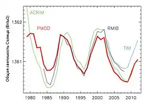Изменения в общей солнечной радиации слишком малы для прямого измерения с помощью технологий, которые были доступны до начала спутниковой эры. Общая светимость Солнца в течение последних трёх 11-летних циклов солнечной активности изменяется с амплитудой примерно 0,1 %[53][54][55], или около 1,3 Вт/м2, за время прямых измерений имеется незначительный отрицательный тренд. Количество солнечной энергии, получаемой на внешней границе атмосферы Земли, в среднем составляет 1361 (по более старым оценкам — 1366) Вт/м2[56][57]. Прямых измерений светимости за более ранний период не существует, интерпретации косвенных индикаторов в научной литературе заметно отличаются. В целом доминирует мнение, что интенсивность солнечного излучения, достигающего Земли, в течение последних 2000 лет была относительно постоянной, с вариациями примерно 0,1—0,2 %[58][59][60]. Вариации светимости Солнца, вместе с вулканической деятельностью, предположительно, способствовали изменению климата в прошлом, например, во время Маундеровского минимума. Чтобы объяснить нынешнее изменение климата, эти вариации слишком слабы[61]. В последние десятилетия их влияние незначительно по величине и направлено в сторону похолодания. Пятый доклад МГЭИК оценивает воздействие Солнца на климат с 1986 года по 2008 год величиной −0,04 Вт/м2[51].