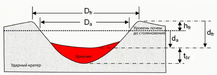 А полная длина кратера относительно верхней части гребня, без учёта толщины брекчии, составит: