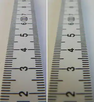 Шкалы глубины резкости, нанесённые на оправы большинства сменных фотообъективов, рассчитаны для фотоплёнки, эмульсия которой обладает светорассеянием, снижающим резкость изображения. Фотоматрицы влияют на разрешение в значительно меньшей степени, позволяя полнее использовать возможности этой же оптики, используемой с современными цифровыми зеркальными фотоаппаратами. Стандарты новейших объективов для DSLR в 1,5 раза строже, и исходят из размера кружка нерезкости, составляющего 1/1500 диагонали полнокадровой матрицы, то есть 28 микрометров[12]. Глубина резкости, определяемая по таким шкалам, вполне соответствует наиболее массовому формату фотоотпечатка 10×15 см. Для более крупных снимков и изображения на мониторе компьютера она оказывается завышенной, поскольку современные сенсоры обеспечивают более высокую разрешающую способность, чем плёнка[12]. В ещё большей степени несоответствие таких шкал проявляется при использовании фотоматриц уменьшенных размеров APS-C и Nikon DX. Для учёта современных технических возможностей могут использоваться альтернативные калькуляторы глубины резкости, рассчитанные исходя из размера пикселя матрицы[13].