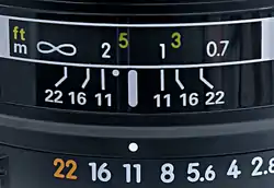 Шкала глубины резкости современного фотообъектива с постоянным фокусным расстоянием. Белые штрихи обозначают границы резкого отображения для разных значений диафрагмы. Видно, что при установленной диафрагме f/11 и текущей дистанции наводки резко отображается пространство от 1 до 2 метров.