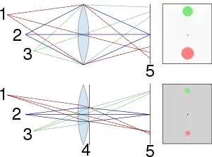 Диаграмма, иллюстрирующая зависимость глубины резкости от относительного отверстия. Точки 1 и 3, находящиеся не в фокусе, при закрытой диафрагме 4 дают кружки рассеяния меньшего диаметра