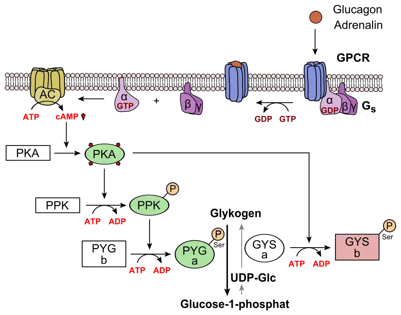 Механизм действия глюкагона обусловлен его связыванием со специфическими глюкагоновыми рецепторами клеток печени. Это приводит к повышению опосредованной G-белком активности аденилатциклазы и увеличению образования цАМФ. Результатом является усиление катаболизма депонированного в печени гликогена (гликогенолиза). Глюкагон для гепатоцитов служит внешним сигналом о необходимости выделения в кровь глюкозы за счёт распада гликогена (гликогенолиза) или синтеза глюкозы из других веществ — глюконеогенеза. Гормон связывается с рецептором на плазматической мембране и активирует при посредничестве G-белка аденилатциклазу, которая катализирует образование цАМФ из АТФ. Далее следует каскад реакций, приводящий в печени к активации гликогенфосфорилазы и ингибированию гликогенсинтазы. Этот механизм приводит к высвобождению из гликогена глюкозо-1-фосфата, который превращается в глюкозо-6-фосфат. Затем под влиянием глюкозо-6-фосфатазы образуется свободная глюкоза, способная выйти из клетки в кровь. Таким образом, глюкагон в печени, стимулируя распад гликогена, способствует поддержанию глюкозы в крови на постоянном уровне. Глюкагон также активирует глюконеогенез, липолиз и кетогенез в печени.