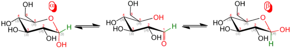 В растворах α-D-глюкопираноза и β-D-глюкопираноза существуют в равновесии и взаимопревращаются через образование открытоцепной формы. Равновесная доля α-аномера при 31 °C составляет 38 %, а более устойчивого β-аномера — 62 %[7]. Чистые аномеры можно получить в кристаллическом виде: α-аномер кристаллизуется из воды в виде моногидрата, а β-аномер кристаллизуется из пиридина[8].