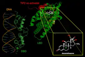 - Stevens A, Garside H, Berry A, Waters C, White A, Ray D (May 2003). “Dissociation of steroid receptor coactivator 1 and nuclear receptor corepressor recruitment to the human glucocorticoid receptor by modification of the ligand-receptor interface: the role of tyrosine 735”. Mol. Endocrinol. 17 (5): 845—59. DOI:10.1210/me.2002-0320. PMID 12569182.