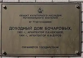 - № 21 — Доходный дом А. Ф. и Н. Ф. Бочаровых (1902, архитектор Л. Н. Кекушев[5]).