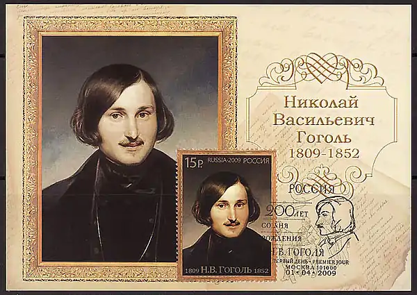 На почтовой карточке и на марке: портрет Н. В. Гоголя работы Ф. Моллера, 1840-е годы, Государственная Третьяковская галерея. Гашение первого дня: Москва, отделение связи 101000, 01.04.2009