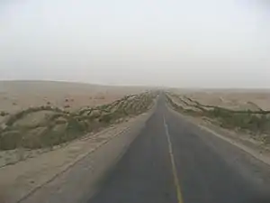 В городе Корла перекрёсток с 314-й трассой. В пустыне трасса проходит западнее озера Лобнор.