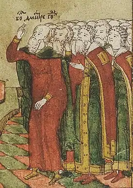 ![]() Дмитрий Годунов в толпе бояр на патриаршем богослужении (миниатюра Годуновской псалтыри, 1594) | |