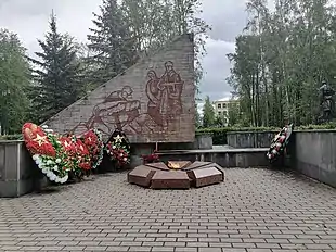 Старая Русса. Рельеф «Смена партизанского движения в Старой Руссе», смертельно раненый командир 4-й Старорусской партизанской бригады С. М. Глебов, его поддерживает Лёня Голиков