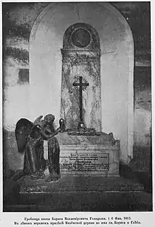 Здесь предано тело земле генерал-лейтенанта и разных орденов кавалера князя Бориса Владимировича Голицына на знаменитой Бородинской битве следствия полученной раны августа 26 дня, родившегося 1769 года и скончавшегося в Вильне в самый день от рождения своего 1813 года генваря 6 дня.