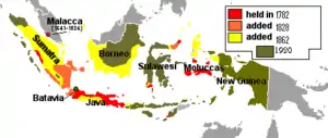Как и другие колониальные образования, Голландская Ост-Индия создавалась в острой конкурентной борьбе как с местными государственными образованиями, так и с другими колониальными державами (Великобританией, Португалией, Францией, Испанией). Долгое время имела преимущественно талассократический характер, представляя собой ряд прибрежных факторий и форпостов, окружённых владениями местных малайских султанов.